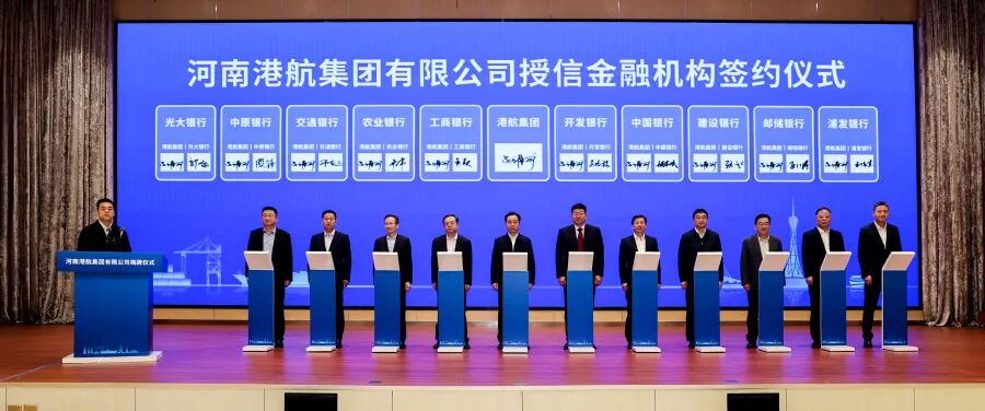 在揭牌仪式现场,河南港航集团与国开行、工商银行、中国银行、农业银行、建设银行、交通银行、邮储银行、浦发银行、中原银行、光大银行等10家金融机构共同签订战略合作框架协议,授信意向额度共计1403亿元,全力支持港航项目的建设发展。
