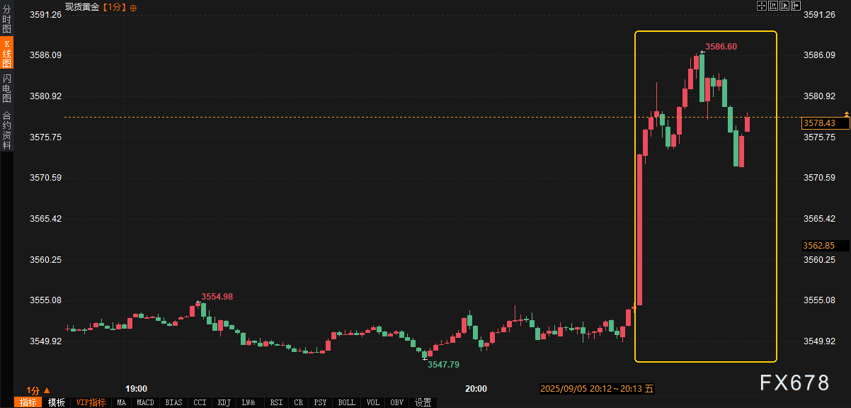 非农数据公布后,金融市场迅速做出反应,美元指数短线急跌至97.57,日内跌幅扩大至0.73%,创四日新低。美债收益率同样承压,10年期美债收益率下跌6.7个基点至4.109%,2年期收益率下跌6.2个基点至3.529%,2/10年期收益率曲线陡化至60.4个基点,反映市场对短期利率下调的强烈预期。与此同时,避险资产和风险资产均出现显著上涨。现货黄金突破3580美元/盎司关口,创历史新高3582.77美元/盎司,日内涨幅达1.02%;现货白银突破41美元/盎司,报41.09美元/盎司,涨幅1.10%。美股期货也受到提振,纳斯达克100指数期货盘前涨幅扩大,标普500指数期货收窄跌幅,显示投资者风险偏好有所回升。