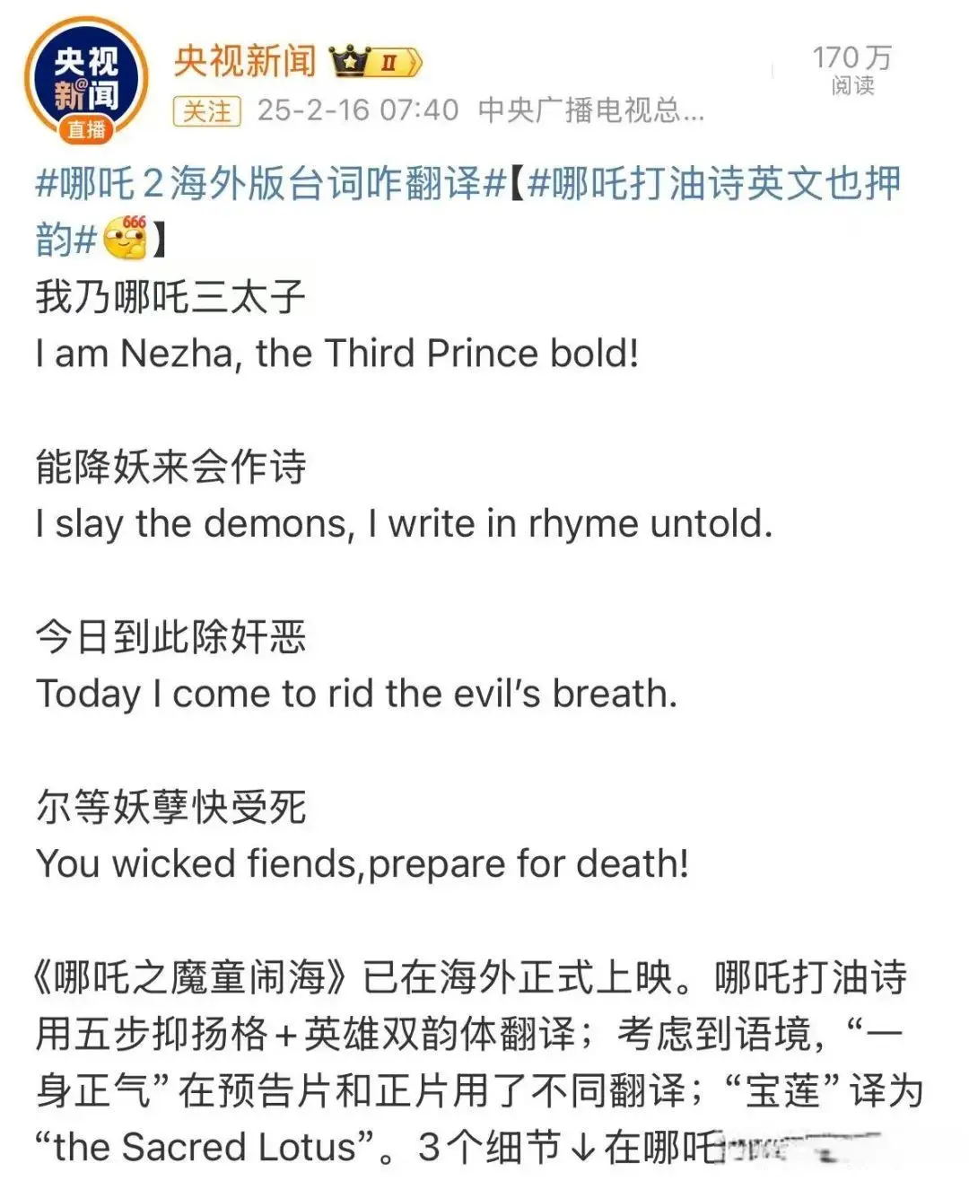 尽管《哪吒2》的翻译团队已竭尽全力,但文化隔阂注定难以完全跨越——无论多么用心,翻译过程中仍不可避免地出现语义损耗,甚至误读与曲解。