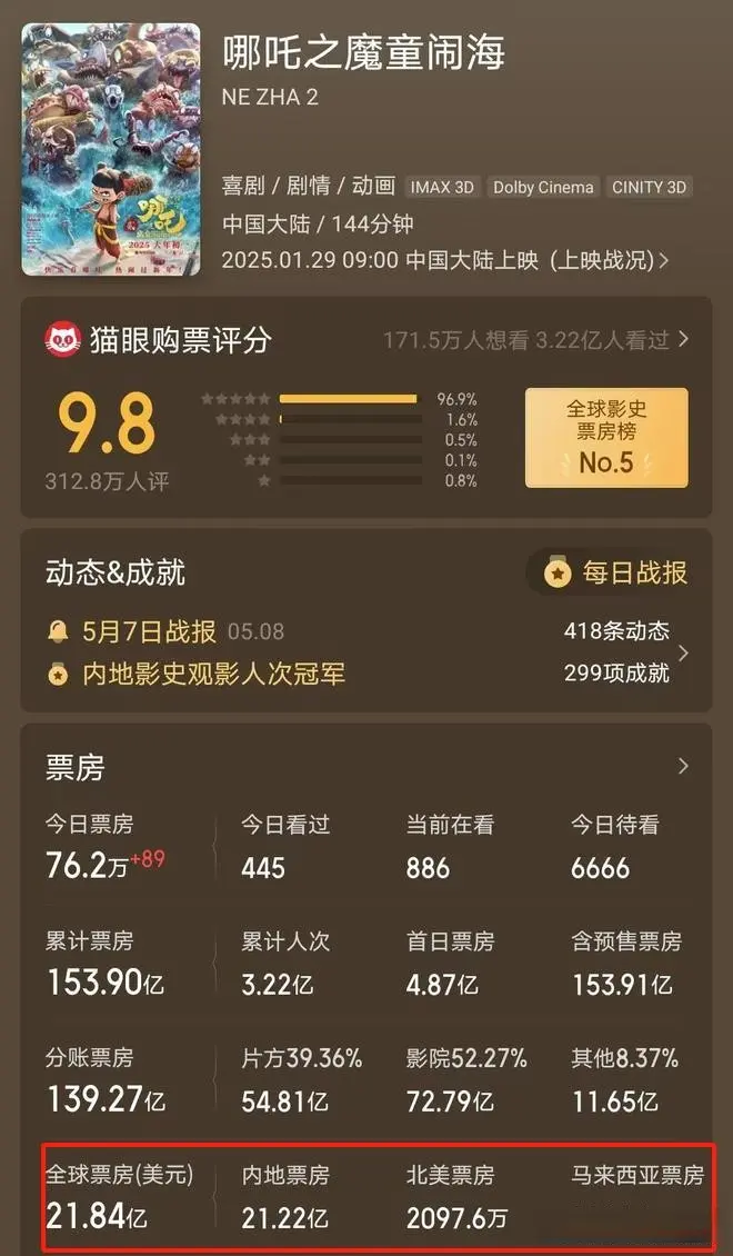 一个略显尴尬的现实是,《哪吒2》虽跻身全球影史票房前五,但其惊人成绩几乎全靠国内观众支撑,海外票房占比微乎其微。