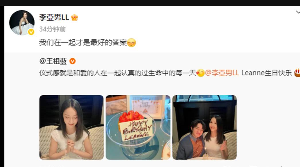 我们本期说下艺人王祖蓝和李亚男,25日,王祖蓝在社交平台上晒出合照为老婆李亚男庆生,二人坐在蛋糕前亲密合影,夫妻俩笑容满面,感情恩爱又甜蜜!王祖蓝在线表白老婆:“仪式感就是和爱的人在一起认真的过生命中的每一天,Leanne生日快乐。”李亚男回复道:“我们在一起才是最好的答案。”王祖蓝晒出蛋糕照片,夫妻俩好幸福。李亚男对着蛋糕许愿。